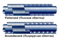 Каждая обмотка придаёт свою, уникальную изюменку звучанию инструмента. С обмоткой типа «Roundwound» мы уже знакомы, еще раз ее можно рассмотреть на рис.1. Такая обмотка дает максимальную звонкость и бархатистость, которая особенно заметна на первое время после установки струн. Есть еще два не менее популярных типа обмотки стальных струн: «flatwound» и «groundwound», их можно рассмотреть на рис.2. Оба вида обмотки "съедают" свист и неприятные звуки, которые издают пальцы при скольжении по струнам. Это достигается потому что внешняя сторона обмотки плоская. Такой вид струн очень часто иcпользуют гитаристы, которые записывают на студии через микрофон.